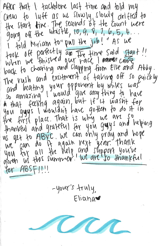 My sister and I want to thank you so much for your help and financial support to give us the opportunity to travel to North Carolina and compete in Youth Champs. At this regatta we ran into a big issue. On the practice day (day before the regatta) it was blowing about 20 knots with big swells. When coming in we capsized, and while riding the boat up our mast snapped. The reason for snapping our mast is still undetermined. Due to breaking our mast my sister and I were unable to sail the first day but were able to find a mast and compete the rest of the week against the top youth 29er sailors in the U.S. With a day of racing taken from us, we were left with results that showed hard work through only 6/10 races. Voted by the coaches, judges, and sailors we were award the sportsmanship award.